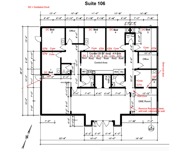 large reception, 6 patient rooms, 2 large procedure rooms, 2 physician offices, large nurses station, and